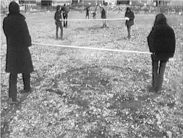 35 min, b&w, sound, 16mm film transferred to digital 35 min, b&w, sound, 16mm film transferred to digital Film, 16 mm, shown as video, black and white and sound. Jonas continued to manipulate these delays in her subsequent performance, delay delay (1972) and film, song delay (1973). Varias figuras ejecutan acciones enigmáticas luchando contra el... First performed in lower manhattan in 1972, the footage was shot from the roof.